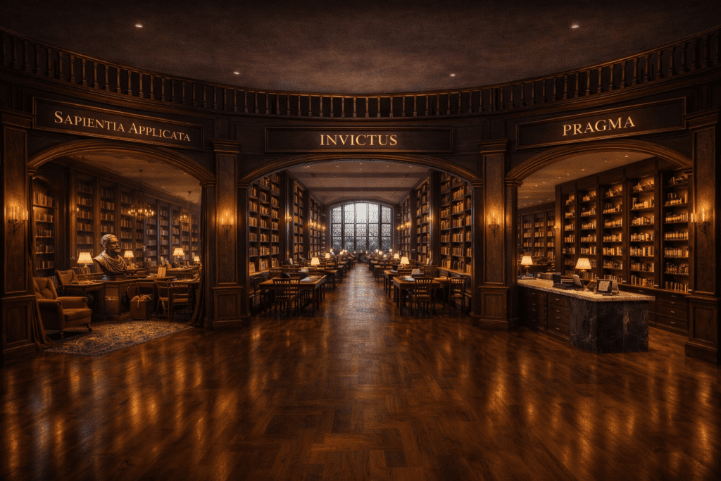 "Esta é a nossa bancada do mestre artesão, o Selo Sapientia Applicata." Ele o guia por corredores com placas como Mestres Eternos e Vozes Inquietas. "Aqui, a filosofia não é abstrata. Pegamos a sabedoria de Sêneca, de Da Vinci ou Peter Drucker e a transformamos em ferramentas mentais. É o manual para construir uma mente resiliente, uma carreira com propósito, uma vida com significado."