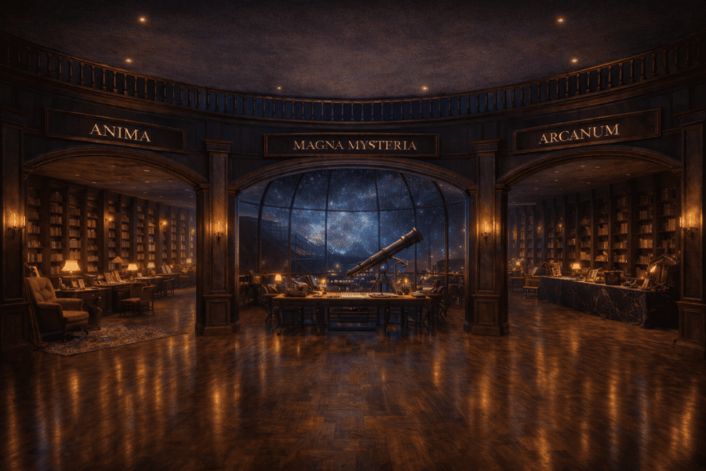 "E esta… é a nossa câmara mais profunda. O Selo Magna Mysteria." A voz dele é quase um murmúrio. "De onde viemos? Por que estamos aqui? Estamos sozinhos? Aqui, investigamos as cosmologias esquecidas, a história proibida, os grandes enigmas. Não oferecemos respostas fáceis. Apenas as perguntas mais importantes.