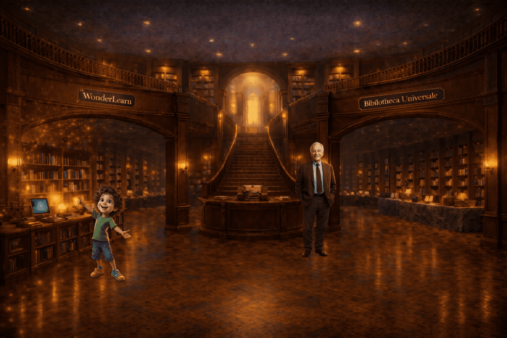 "E este", diz Alcides, baixando a voz, "é o Selo Bibliotheca Universale. O alicerce do pensamento." Ele desliza a mão por uma fileira de livros. "Homero, Platão, os Vedas, Shakespeare… as fontes primordiais.